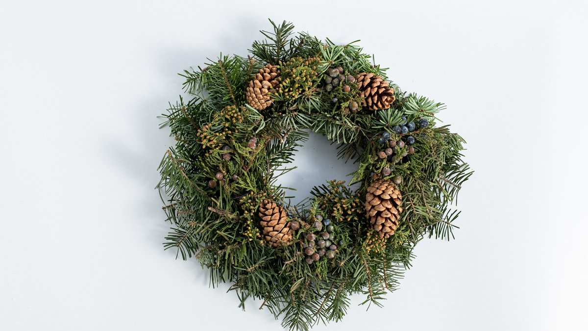 Χειροποίητο στεφάνι από αληθινά κλαδιά έλατου και χριστουγεννιάτικα στολίδια