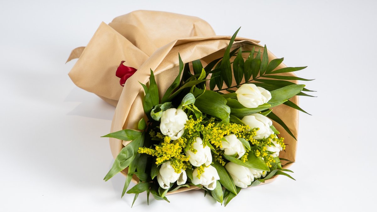 Mπουκέτο με τουλίπες και διάφορες πρασινάδες. Επίλεξε το χρώμα και το μέγεθος του μπουκέτου
