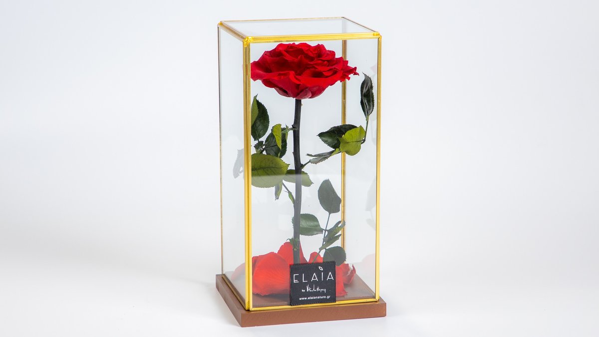 Αφυδατωμένο τριαντάφυλλο με το κοτσάνι του σε γυάλινη τετράγωνη καμπάνα με ξύλινη βάση και ροδοπέταλα ή moss στον πάτο. Επίλεξε το χρώμα που επιθυμείς